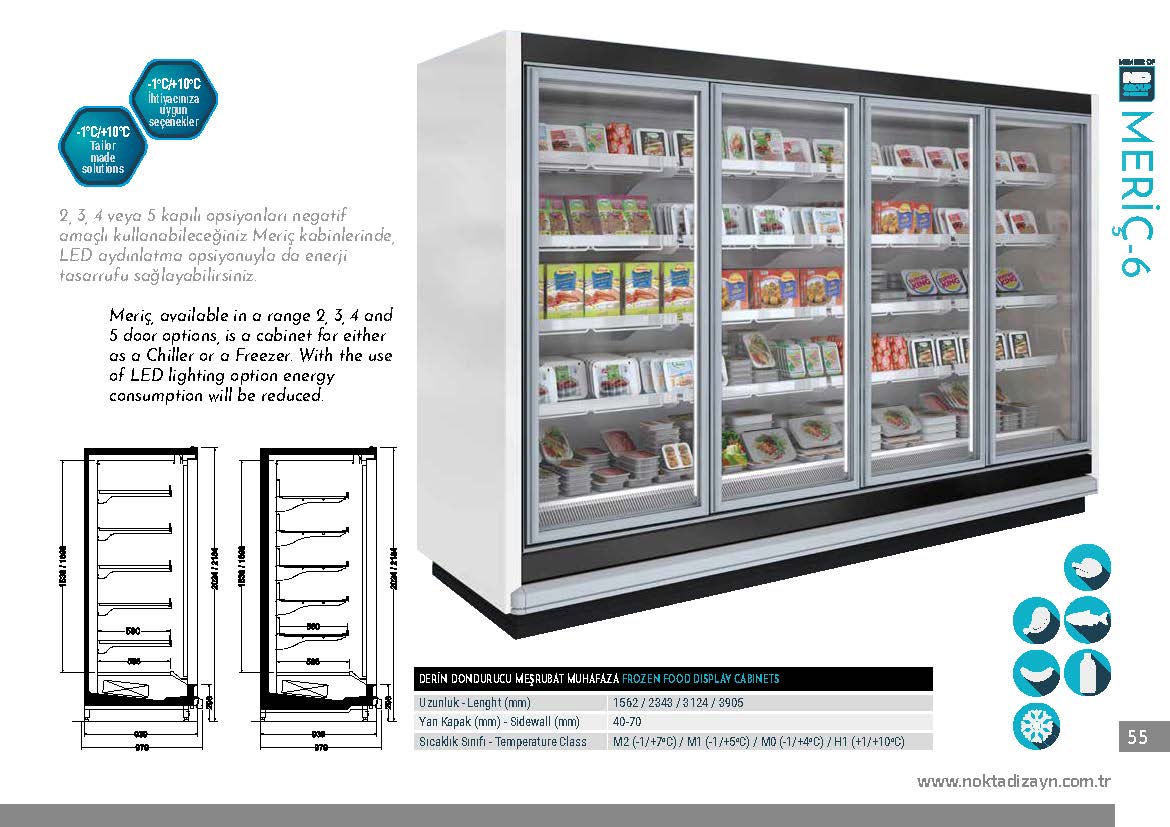 Meriç 6, 2, 3, 4 veya 5 kapılı opsiyonlarıyla donmuş gıda ve soğuk içeceklerin muhafazasında kullanılabilen çok yönlü bir dolaptır. Negatif sıcaklık kullanımı için ideal olup, LED aydınlatma seçeneği sayesinde enerji tasarrufu sağlar. Farklı kapı sayısı seçenekleriyle mağaza düzenine kolay uyum sağlar.